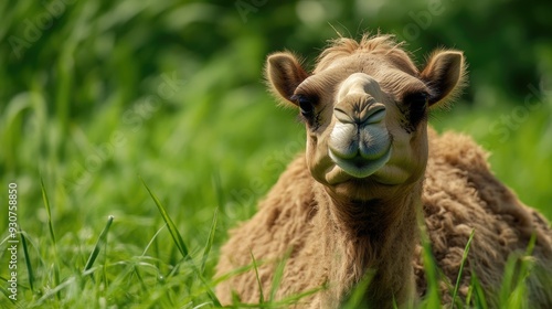 © Olena, Fototapeta premium Camel Hump Day. Bactrian Camel Standing on Green Grass in Wild Desert Landscape