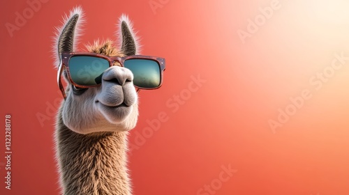 Fototapeta premium Camel wearing sunglasses and smiling. The image has a fun and lighthearted mood. The camel is the main focus of the image, and the sunglasses add a playful touch to the scene