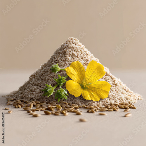 © visoot, Fototapeta premium Camelina seed powder with yellow flower and green leaves on beige background, natural healthy ingredient, organic superfood, closeup, soft lighting