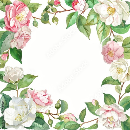 © Sirirat, Naklejka premium Camellia frame clipart, flower border, watercolor illustration, white and pink, isolated on white background,