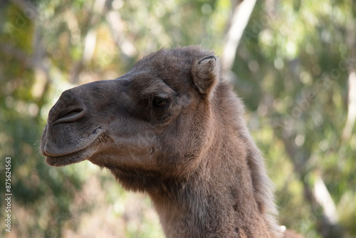 © susan flashman, Obraz premium Camels are mammals with brown eyes, long lashes, a big-lipped snout and a humped back.