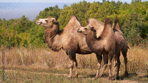 © ROMAN DZIUBALO, Fototapeta premium Camels grazing in summer. Two bacterians in the pasture against a backdrop of green vegetation.