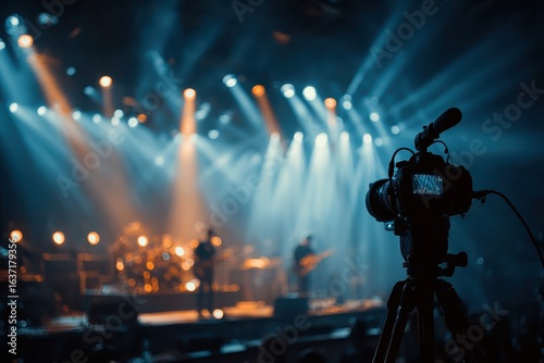 Fototapeta premium Camera filming a rock concert with blue and orange stage lights. Show the process of capturing live music performance footage.