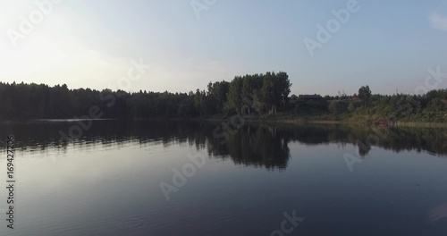 Fototapeta premium Camera flight over the lake, clear like a mirror. It reflects the trees on...