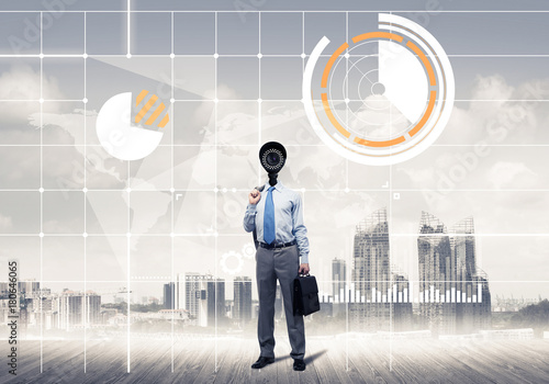 © adam121, Obraz premium Camera headed man standing on wooden floor against modern citysc