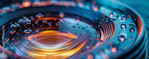 © Michael, Fototapeta premium Camera lens reflecting colorful lights with water droplets