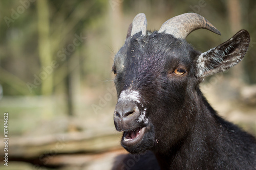 Fototapeta premium Cameroon dwarf goat resting / relaxing on huge piece of wood and