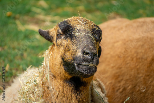 © Adam, Fototapeta premium Cameroon sheep lying on green grass, farm animal resting, frontal portrait, head close-up. sleeping sheep on a hot day