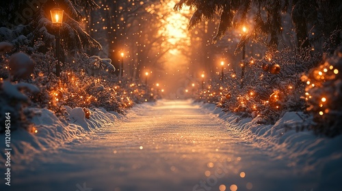 Naklejka premium Camino Nevado con Faroles y Árboles de Navidad Decorados