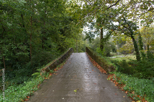 Fototapeta premium Camino que se adentra entre árboles en un día de lluvia.