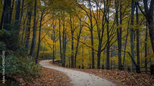 Fototapeta premium Camino serpenteante en un bosque verde, con luz del sol iluminando el follaje...