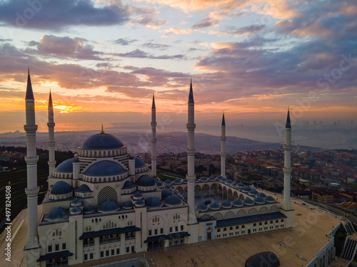 Fototapeta premium Camlica Mosque in the Sunset Drone Photo, Uskudar Istanbul Turkey