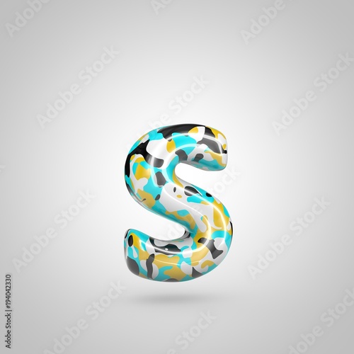 © Whitebarbie, Naklejka premium Camouflage letter S lowercase with cyan, black and yellow camouflage pattern isolated on white background.