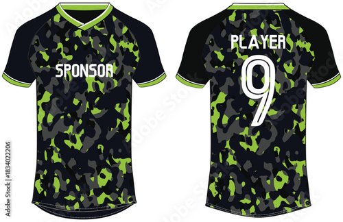 © JERZEY DESINZ, Obraz premium Camouflage pattern Sports jersey t shirt design Flat sketch illustration , football jersey concept with front and back view for Cricket, soccer, Volleyball, Rugby, tennis and badminton uniform