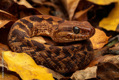 Obraz premium Camouflaged Brown Snake Resting on Autumn Leaves in a Forest