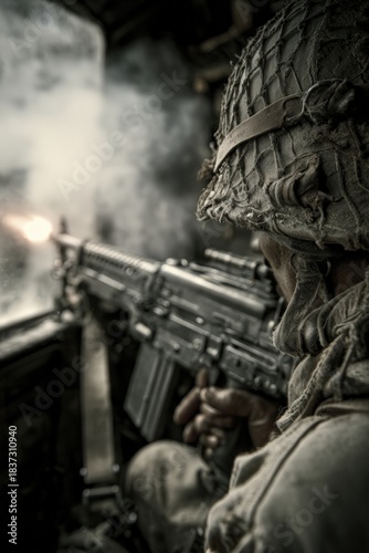 © spyrakot, Obraz premium Camouflaged Fighter Engaging Targets with Heavy Machine Gun in Battle Scene