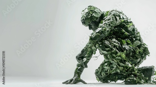 © Imsuniyah, Obraz premium Camouflaged Figure Kneeling in a Green Suit