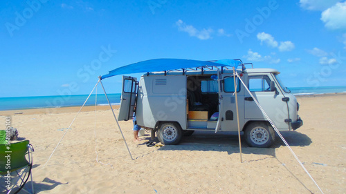 © Khristina, Fototapeta premium Camper on the beach with an awning from the sun. Vacation, clear, Sunny day. Camping.