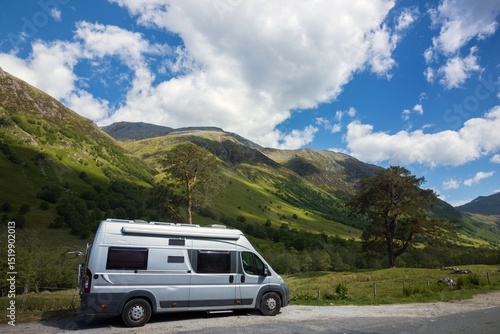© Lars Gieger, Fototapeta premium Camper van parking on the road at the popular Glencoe valley in the Scottish highlands, Scenic Routes