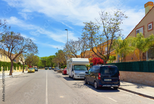 Obraz premium Campervan on parking on street near House in Spain. Family camper van vehicle at Villa. Motorhome lifestyle travel to sea. Travel on Campervan along Spain coast. Car on Parking on street in suburb.