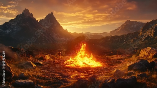 Fototapeta premium Campfire amidst rugged mountains under a golden sunset offering warmth and...