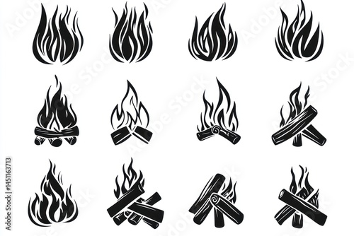 Fototapeta premium Campfire flames icons; wood burning; outdoor recreation; white background; design elements