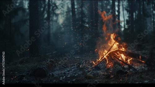 © Good moose, Naklejka premium Campfire in a dark forest setting at dusk. The fire is central, with sparks rising amidst the trees, creating a cozy atmosphere.