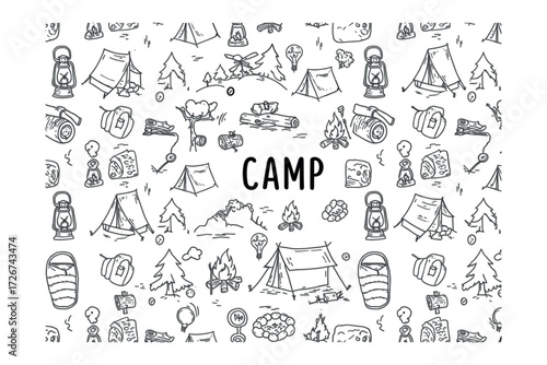 © Sophia, Obraz premium Camping activities and essentials scenic outdoor setting creative nature background playful style. Vector illustration
