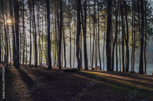 Naklejka premium Camping and tent in pine forest