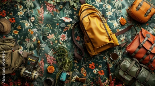 Naklejka premium 155. Camping Gear, realistic style, colors full, floral pattern, high angle,...