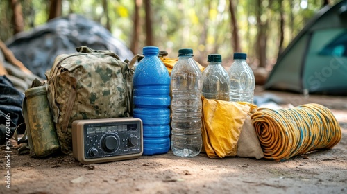 Fototapeta premium Camping gear, water bottles, radio, backpack