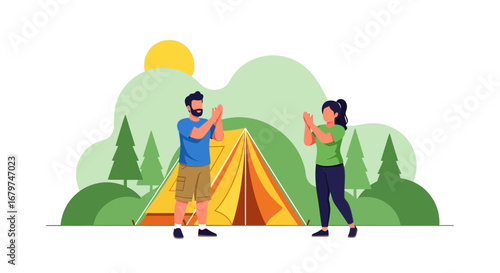 Fototapeta premium Camping Illustration with Couple Clapping in Joy Near Their Tent in Nature
