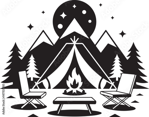 © vector design, Fototapeta premium Camping in the Mountains: A classic illustration of a tent pitched in a tranquil mountain setting, surrounded by majestic peaks and towering evergreen trees.