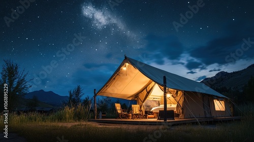 © Vongvilay, Obraz premium camping under the stars in a remote, picturesque location with all amenities provided.