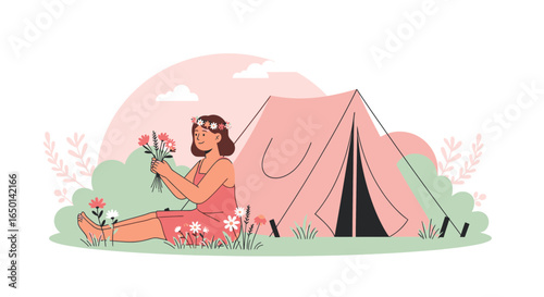 © Komang, Fototapeta premium Camping With Nature A Young Woman Enjoying Outdoors And Relaxing In The Tent