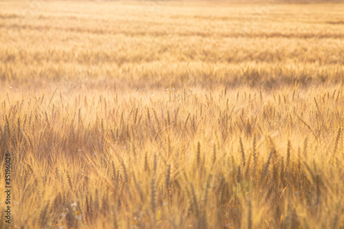 Fototapeta premium Campo de cereales al amanecer con luz dorada