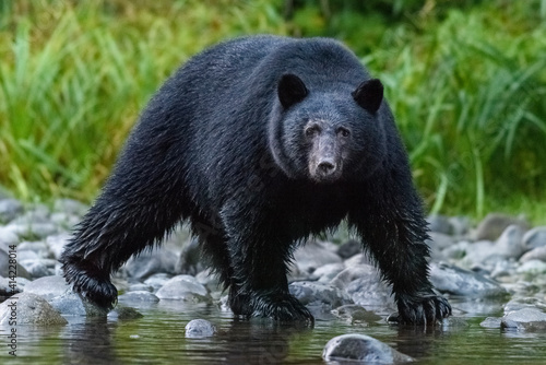 Fototapeta premium Canada, British Columbia. Black bear searches for fish at rivers edge.