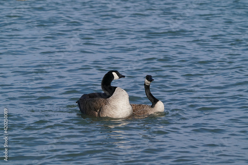 © Janet, Obraz premium Canada Geese at harbour in early spring, one with damaged beak, flying, flapping, mating and after mating