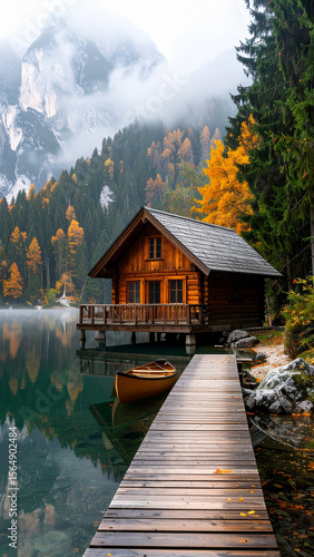 Naklejka premium canadian cabin by the lake with canoe and mountains photo