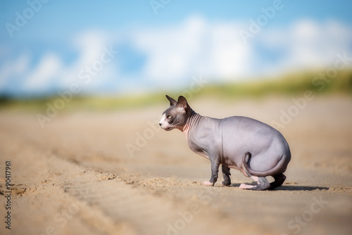 © otsphoto, Fototapeta premium canadian sphynx cat on the beach