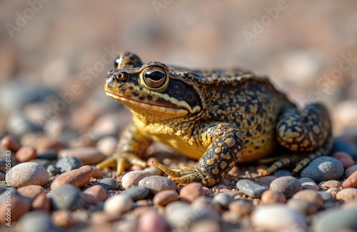 © miss irine, Fototapeta premium Canadian toad sits on colorful pebbles near water. Small amphibian has yellow brown skin with dark spots. Wild animal looks forward with big dark eyes.