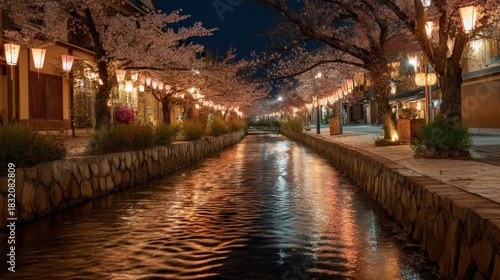 Fototapeta premium Canal at night illuminated by paper lanterns and cherry blossoms, reflecting light on water. Traditional japanese scenery for travel and tourism.