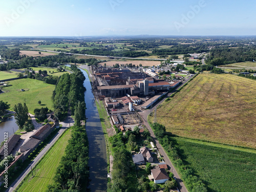 © sissoupitch, Fototapeta premium Canal de Bourgogne seen from the sky with fields, meadows, a house and a factory