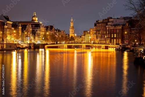 © Leo Lintang, Fototapeta premium Canal in Amsterdam with illuminated buildings and reflection on the water