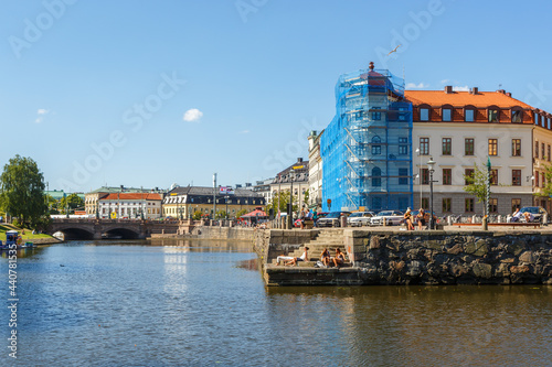 Naklejka premium Canal in Gothenburg with sunbathing people