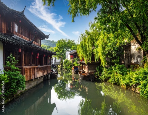 © Kipas, Obraz premium Canal town houses and green trees