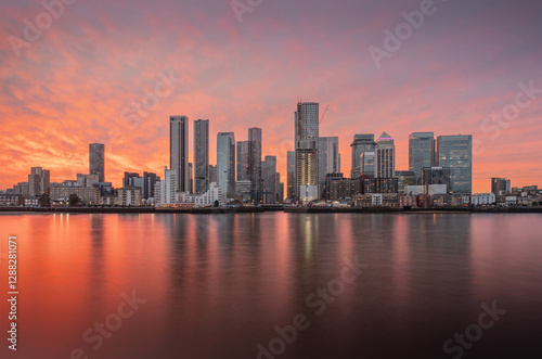 © Ross, Fototapeta premium Canary Wharf shot from the Greenwich peninsula during a beautiful sunset and slack tide, creating a gorgeous image.