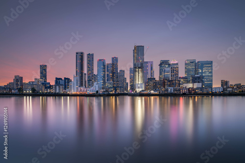 © Ross, Fototapeta premium Canary Wharf shot from the Greenwich peninsula, in the blue hour.