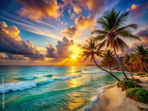 Fototapeta premium Cancun Sunrise: Golden Light, Turquoise Waters, Pristine Beach, Palm Trees