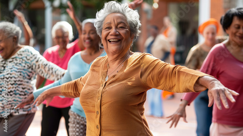 Fototapeta premium Candid capture of a joyful group of seniors showing vitality while dancing,...